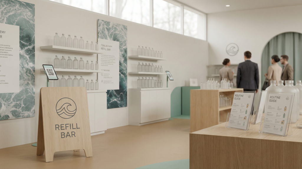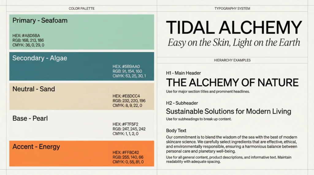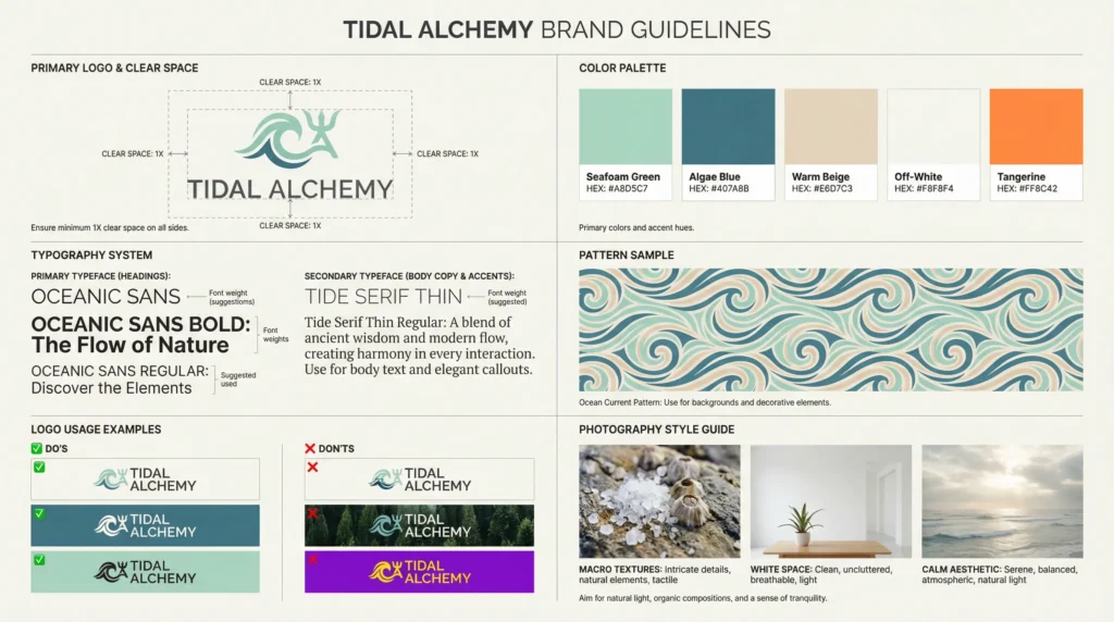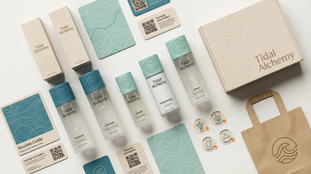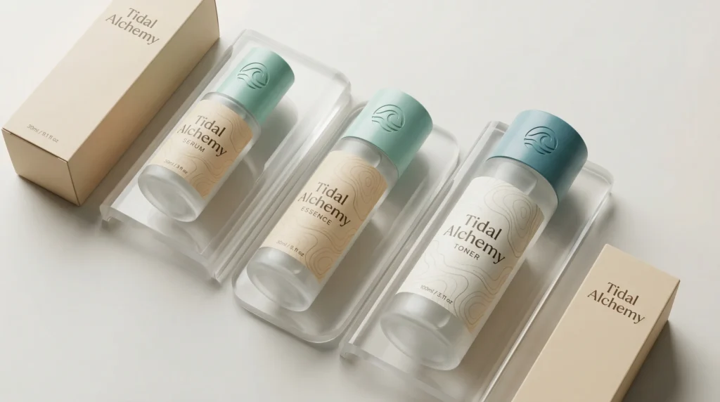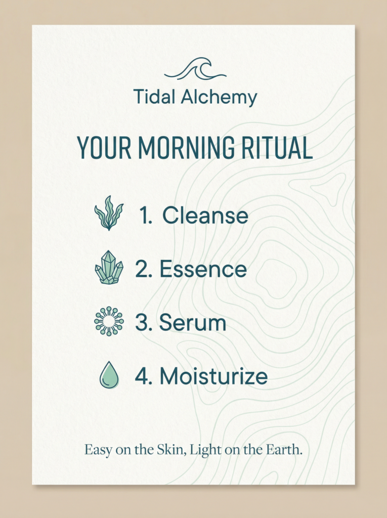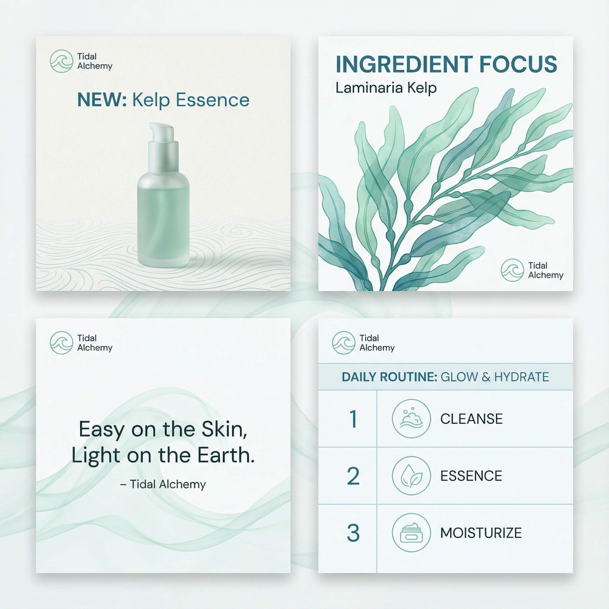 Tidal Alchemy is a premium minimalist skincare brand inspired by ocean botanicals and gentle, science-backed routines that fit effortlessly into daily life. It feels like a modern clean beauty line built around a hero marine ingredient (kelp/seaweed essence) and a calming ritual approach: cleanse, essence, serum, moisturize. The brand positions itself as effective but not aggressive, prioritizing skin comfort and hydration while also signaling eco-conscious choices through its messaging and light, airy tone. Tidal Alchemy is for customers who want skincare that looks refined, feels soothing, and aligns with a quieter, more sustainable lifestyle.